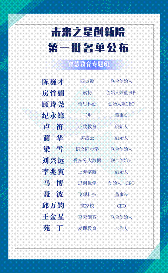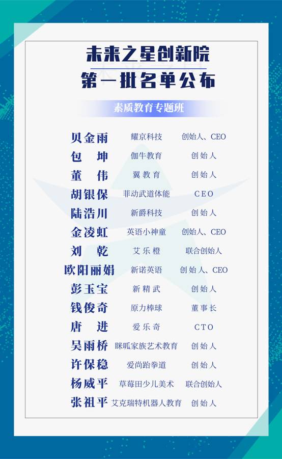 近日,首届“未来之星创新院”(以下简称“创新院”)第一批学员名单正式公布。第一批学员共29人,分为素质教育、智慧教育两个教育板块。其中素质教育创业者15名、智慧教育创业者14名。