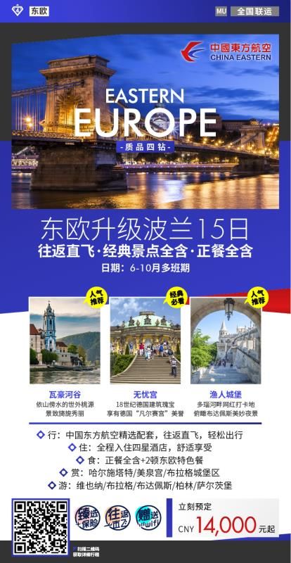 此套产品分为四大系列:东欧升级波兰系列,两大产品涵盖德国、捷克、匈牙利、奥地利、斯洛伐克、波兰六国,适合各年龄段游客;奥捷匈系列,涵盖奥地利、匈牙利、捷克三国,五大产品满足游客对性价比、全家总动员的多元产品需求;两大巴尔干系列产品,为中高端追求深度游客带去特色非凡体验;左手自由行、右手性价比,东欧“爱自由”系列则让更多自由行爱好者乐享东欧!