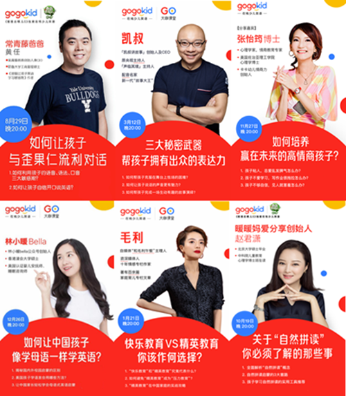 《gogokid家长课堂》主要为家长育儿提供战术指导,解决孩子在学习中产生的实际问题。为此,gogokid专门邀请资深教育从业者为家长传授实用的英语辅导方法并普及相关育儿知识。而《GO大咖课堂》则为家长们提供了育儿的战略意见,让孩子在先进健康的教育理念中茁壮成长,该活动的主讲嘉宾均为泛教育领域头部育儿大咖,“凯叔讲故事”创始人兼CEO凯叔、“常青藤爸爸”黄任、儿童心理学专家张怡筠博士等国内知名育儿“大咖”都曾前来做客,《GO大咖课堂》也因其高含金量的科学理念收获众多好评。