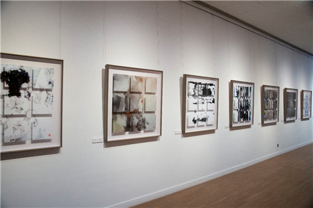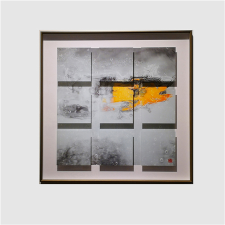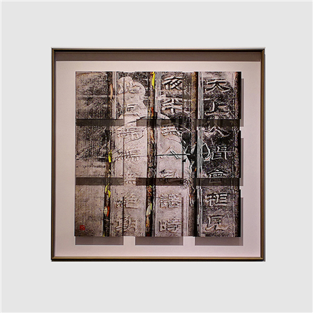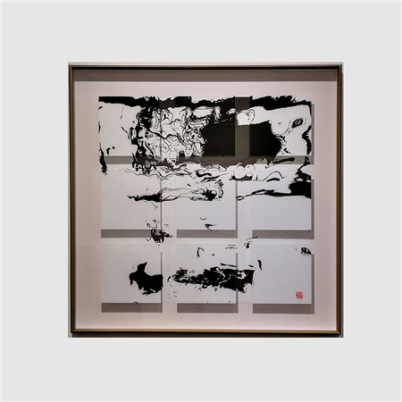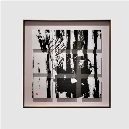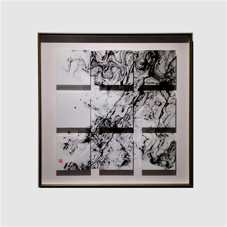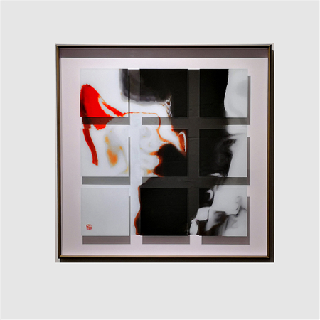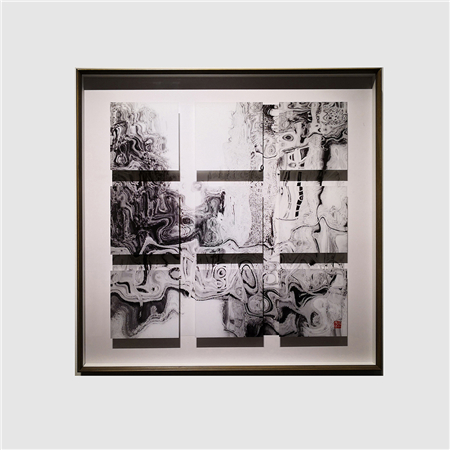 傅文俊在《空山新雨后》、《小楼咋夜又东风》、《行到水穷处》(图2-4;数绘摄影,100 x 100 厘米,2017─2018)中挥洒墨水,绘出一组三乘三的浮凸方格,反映阴影与空间把主图墨迹层层延伸。众多作品中所展现的分层效果,可见他力求打破摄影规范。对傅文俊而言,一张照片可被切割和延展,在它与空间和光线互动时,创出一个全新的艺术角度。在同一个光与暗互相辉映的立体图像中,不同色调的灰色与深黑色的变化并置呈现。