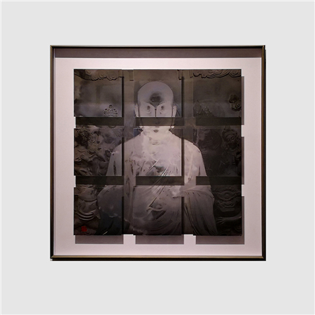 《不二法门》、《宝马》(图5-6;数绘摄影,100 x 100 厘米,2017─2018)等作品以抽象的构图描绘佛陀和唐代宝马。两张作品并非直接描绘佛陀或宝马,而是一个侧面描绘,主题就像被一层轻纱遮盖着,与画笔下如梦似的图像非常相似。傅文俊作品的传统面貌不仅限于技巧表达,更包含融合了当代摄影和古代中国艺术形式,特别是立体雕塑的图像;这就像上文提及的光影意趣,实为平面与立体之间的对话。