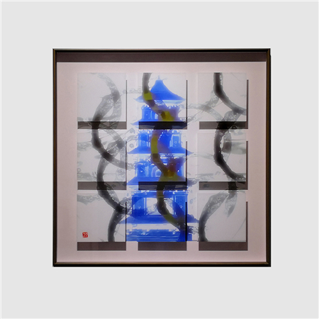 傅文俊在《缘来缘去》和《无人私语》(图7-8;数绘摄影,100 x 100 厘米,2017─2018))两幅摄影作品中,运用颜色来丰富创作主题。他的单色影像与水墨画产生强烈共鸣,其彩色摄影却散发出中国木刻版画的特征。那代表宝塔的淡蓝色调,构成一个由木版墨痕造成的和谐统一的影像。这种特质和重叠的环形图案,塑造出另一种立体的幻象;又或者可以说是一幅帘子或一块动人的面纱。