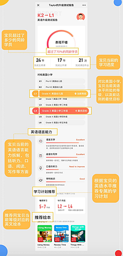 为帮助家长及时、准确地了解孩子当前的英语水平,此次应用升级新增了【测试报告】功能。通过这一功能,家长不仅可以看到小学员入学时的英语水平测试报告,还能够看到孩子每完成一个Level(级别)的课程时解锁的升级测试报告。