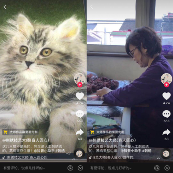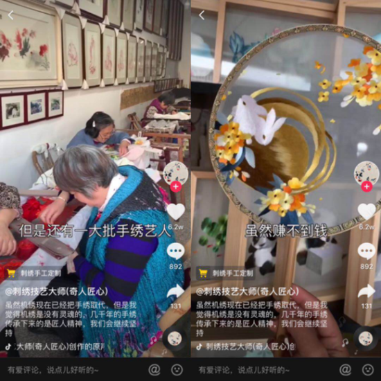 在抖音短视频里,她们带着眼镜,细细地绣出一针一线。在她们的手中,花朵绽开了美丽的笑颜,孔雀舒展开鲜艳的羽毛,一只只色彩斑斓的蝴蝶随风起舞,活灵活现。这些刺绣有时出现在传统的旗袍、扇子上,有时也会出现在时髦的高跟鞋、皮包表面,新颖别致,独具匠心。