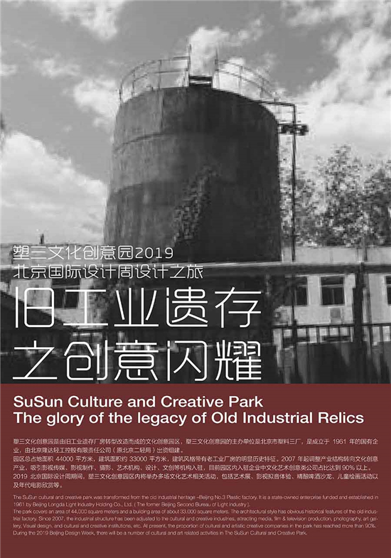 2019年9月,在北京怡人的秋天里,“旧工业遗存之创意闪耀”——塑三文化创意园2019年北京国际设计周设计之旅活动启动。塑三文化创意园位于朝阳区,与798艺术区、草场地国际艺术村相接。园区是由1961年建厂的老国企北京市塑料三厂转型而来,响应政府的文化产业政策,由生产型企业转型为文化创意产业园区,目前正在着力打造文化创意内容平台,每年举办多项文化艺术活动。