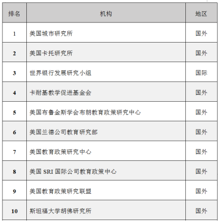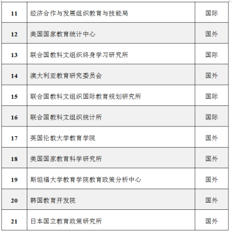 中国教育科学研究院和教育部教育发展研究中心是排名前两位的国内教育智库,长江教育研究院、21世纪教育研究院、北京师范大学中国教育与社会发展研究院、清华大学教育研究院、北京大学中国教育财政科学研究所、厦门大学教育研究院等民间教育智库和高校教育智库也入围全球前80强。