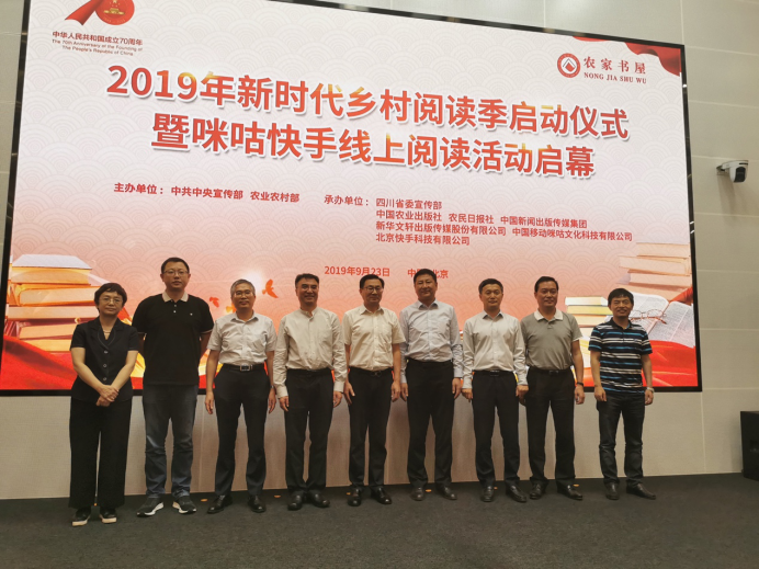 9月23日,2019年新时代乡村阅读季启动仪式暨咪咕快手线上阅读活动启幕仪式在北京快手科技有限公司举行。中宣部印刷发行局局长刘晓凯,农业农村部农村社会事业促进司二级巡视员戴军,四川省委宣传部副部长、省新闻出版局局长周青等出席了启动仪式并讲话。快手科技有限公司高级副总裁余海波致欢迎词。