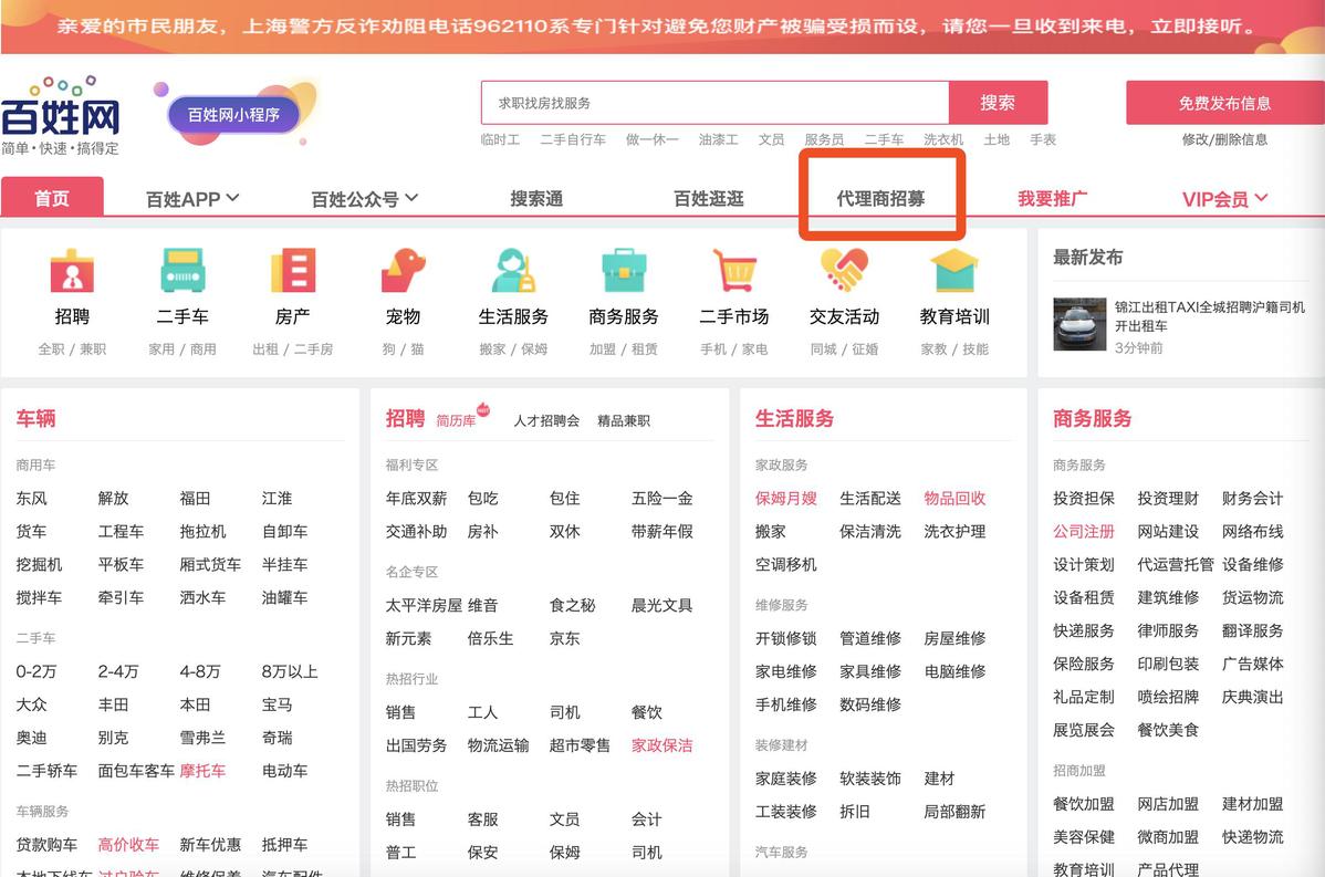 看着这些代理商的优异成绩,更是增加了百姓网的市场信心。随着网络的快速发展,人们已进入了一个信息大爆炸的时代,信息分类必将成为未来发展的一个趋势,而越来越多的合作伙伴也已意识到这一点,意识到了百姓网渠道代理的发展前景,我们也非常欢迎更多志同道合的朋友加入百姓网代理商的大家庭,目前在百姓网官方网站下方就有报名入口。
