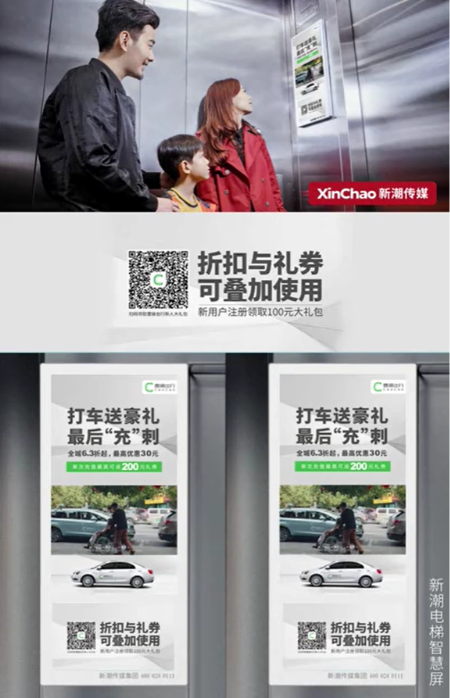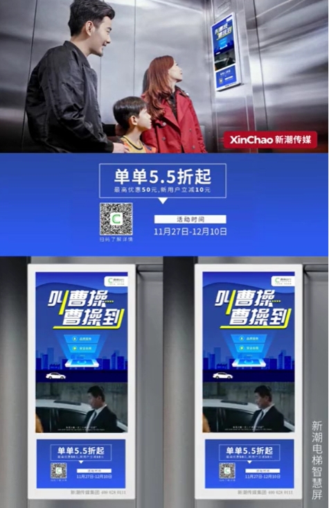 不断升级的“曹操出行”已经覆盖专车、顺风车、同城寄送、旅游出行、企业出行等业务板块,满足消费者更细分的需求。同时,通过用户上下班、回家等都必然会接触到的新潮电梯智慧屏,曹操出行的优质产品和服务精准送到目标用户核心生活场景,在极短时间里高效触达核心用户群体,助力曹操出行不断拉新,提升转化销量。