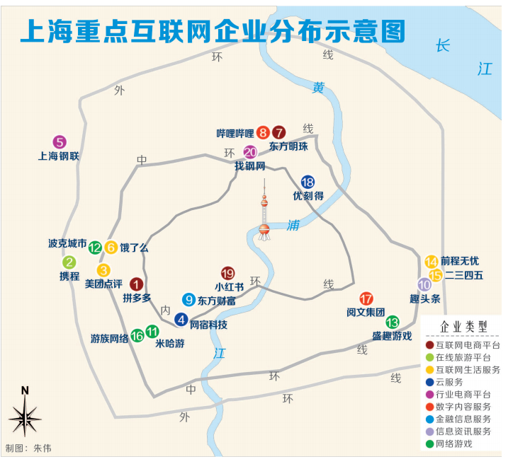 ▲刊登于《解放日报》的“上海重点互联网企业分布示意图”显示,上海的互联网产业形成了一条以中环为轴的“黄金产业腰带”。
