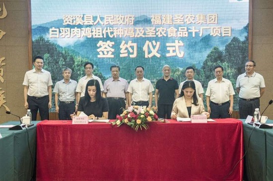 8月6日,圣农集团与江西省抚州市资溪县政府在资溪县大觉山酒店举行“白羽肉鸡祖代种鸡及圣农食品十厂项目”签约仪式,资溪县县长吴淑琴、圣农集团董事长傅芬芳代表双方签订协议,并互换文本。圣农集团创始人傅光明,中科院院士、江西农业大学党委书记黄路生,中国白羽肉鸡首席科学家文杰,江西省农业农村厅副厅长刘光华,抚州市副市长徐国义,资溪县委书记黄智迅等参加了签约仪式。