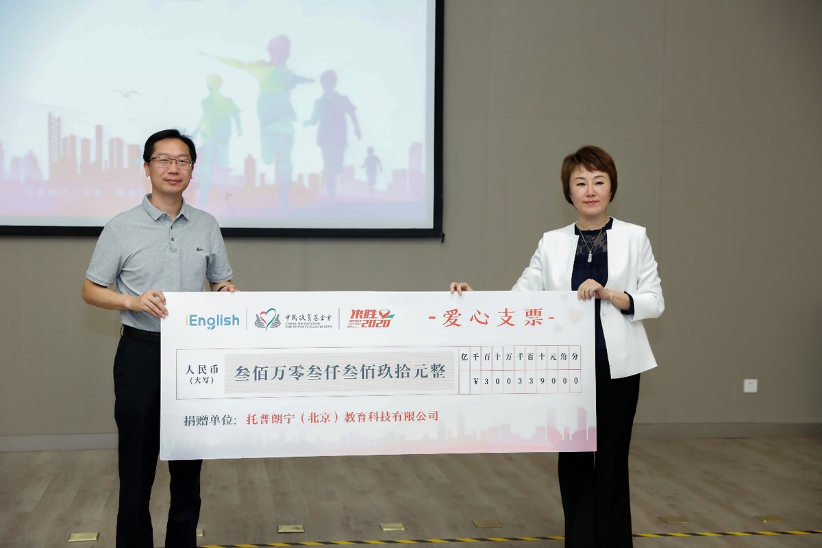 9月10日,由中国扶贫基金会和托普朗宁(北京)教育科技有限公司共同发起的“2020公益未来•iEnglish学业有成项目”在北京启动。托普朗宁联合创始人李白焰、副总裁李斌、全国支持中心总经理方毅,中国扶贫基金会副秘书长王鹏等人出席仪式。