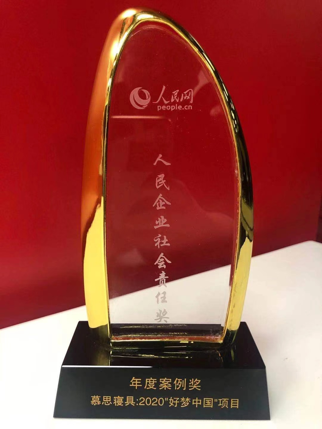 2020年12月12日下午,由人民网主办的人民企业社会责任高峰论坛暨第十五届人民企业社会责任奖颁奖典礼在人民日报社新媒体大厦举行。作为寝具行业的领导者,慕思在2020年推出“好梦中国”项目,致力于推广健康睡眠文化,助力健康中国,被授予年度案例奖!