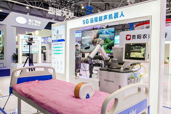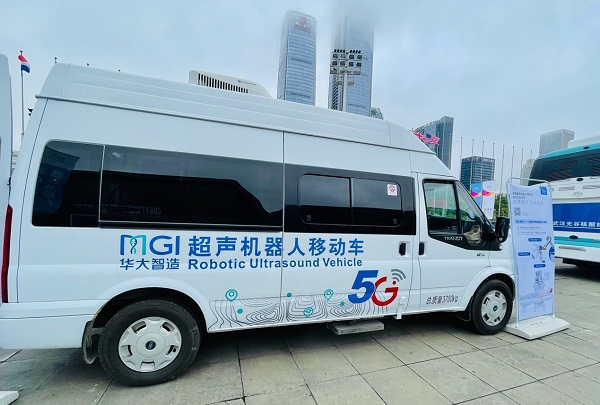 在数博会入口的展区,华大智造最新落地的5G远程超声机器人移动车正在与深圳超声专家连线为观众展示实时、精准的远程超声诊断技术。