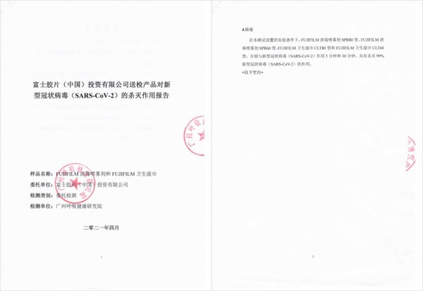 由广州呼吸健康研究院出具的FUJIFILM 消毒喷雾/湿巾“对新冠病毒的杀灭作用报告”封面及结论页