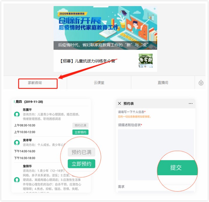 家长们可以在线上预约心理咨询相关课程,了解自己跟孩子之间存在的问题。让亲子关系在开导和沟通中发展进步。