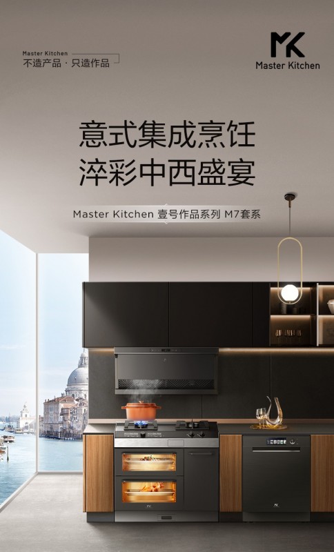 在设计上MK以意大利经典设计为灵感,将整厨设计聚焦于前沿的厨房与室内设计色彩、材料及工艺趋势,运用木材、岩板、大理石和玻璃等具有纹理质地的自然材料,精工锻造高端的整厨作品——MK壹号作品系列M7套系,用艺术化升级多变的厨间体验。