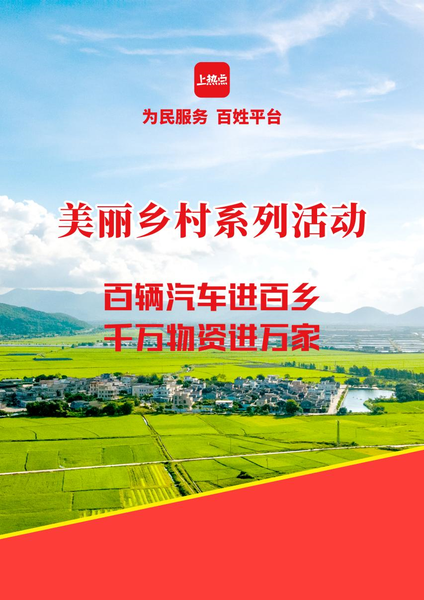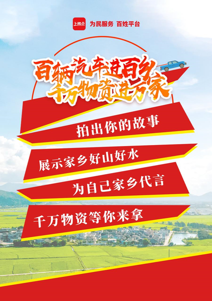 乡村振兴,有你有我!只要拿起手机,就能为乡村振兴助力。上热点平台希望人人都能为自己的家乡代言、为美丽乡村建设助力。“让百辆汽车进百乡,让千万物资进万家”。