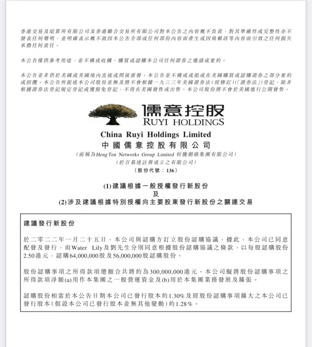 儒意控股(恒腾网络)董事会认为,大股东腾讯此次透过旗下子公司Water Lily溢价认购公司股份,再次展示出其对公司业务长远发展的坚定信心以及对公司管理团队的肯定。