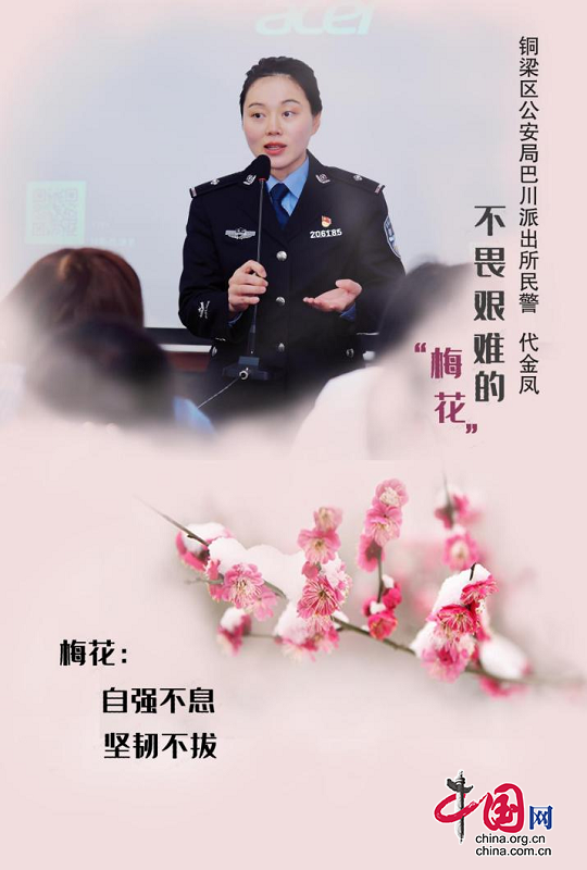 铜梁区公安局巴川派出所民警 代金凤:“墙角数枝梅,凌寒独自开”。代金凤作为一名年轻的女警,不畏艰难,始终扎根基层一线。她虽然个子不高,但总在扫黑除恶时冲锋在前;她从警时间不长,却在审讯犯人时游刃有余;她初为人母,却懂得悉心照料每一个走丢的孩子。她用行动诠释担当,用尽责展现风采。