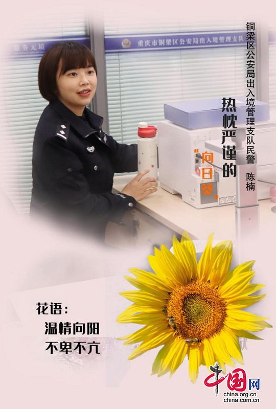 铜梁区公安局出入境管理支队民警 陈楠:在很多人眼中,窗口的工作是枯燥乏味的,在这个岗位上,陈楠一干就是10年。窗口前的她是一位微笑使者,始终对每一位办事群众笑脸相迎,她一遍一遍解答群众疑问,一遍一遍办理着各项业务,每天接打电话、现场答复、接待群众上百人次。陈楠每次温馨的话语,如花的笑脸,都让人如沐春风,忙碌的办事窗口,也被这柔情与细腻擦亮。