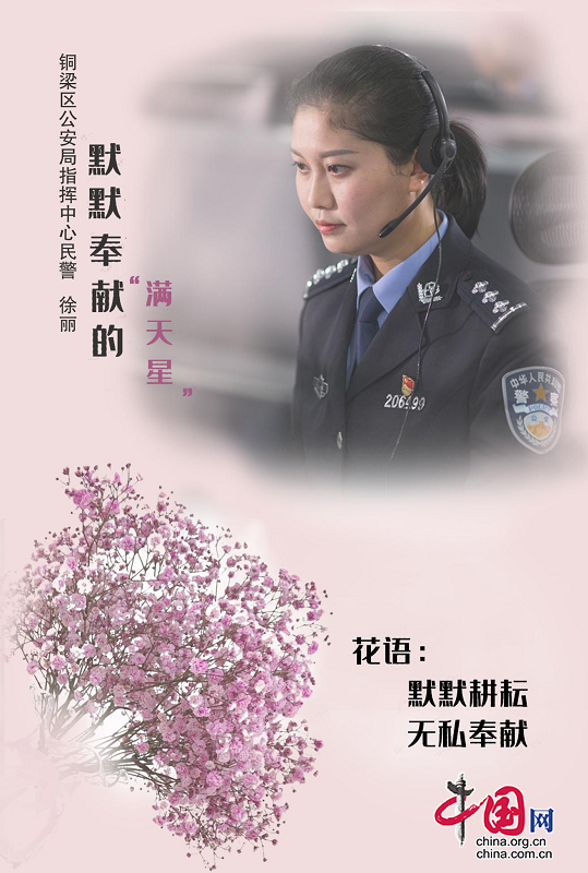 铜梁区公安局指挥中心民警 徐丽:和其他鲜艳的花朵相比,满天星开得很小,甘居配角和幕后,亦如默默奉献的指挥中心民警。作为一个特殊岗位,每天24小时值班备勤,每年工作时长达到2500个小时,实时接收紧急任务,传达救援指令,上报工作报表。在繁琐的工作中,她们从不抱怨、从不懈怠,坚守岗位,热忱回应群众的每一次求助。